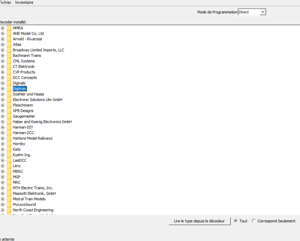 JMRI vous permet de choisir dans une liste de plus de 50 fabricants du commerce.
