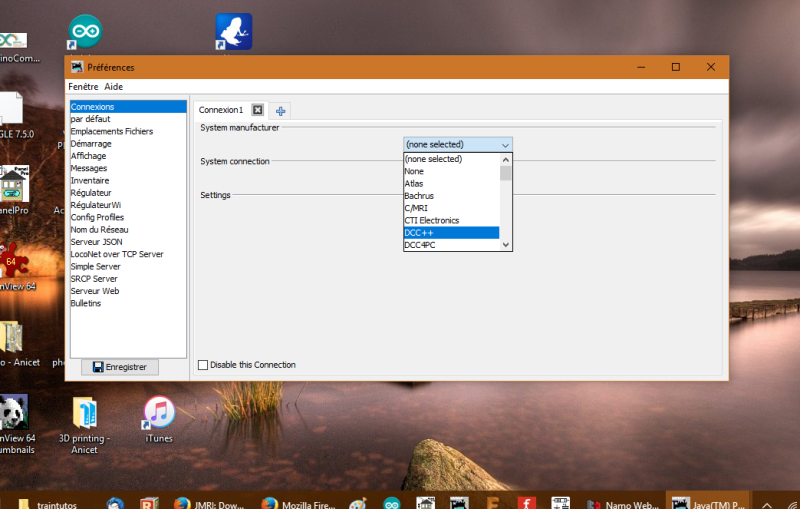 - Pour la première exécution, JMRI vous amène directement dans le paramètrage de la centrale. - Comme sur l'écran, choisir DCC++ pour la centrale "Bleue" ou une autre centrale du commerce si vous posséder une autre centrale .