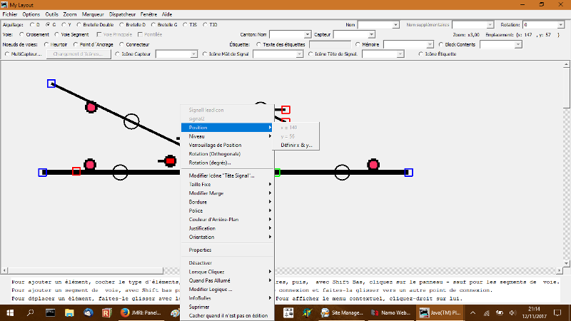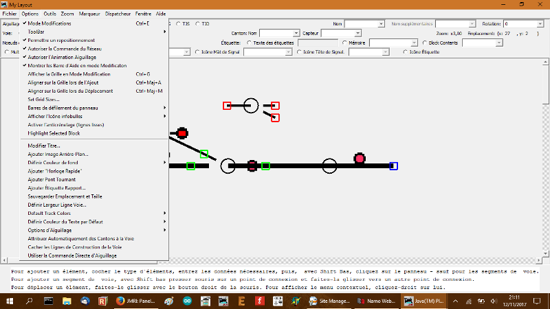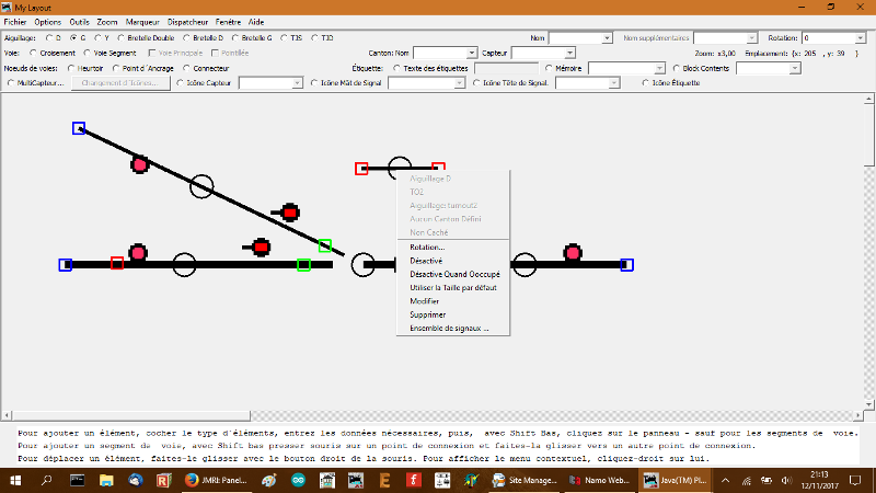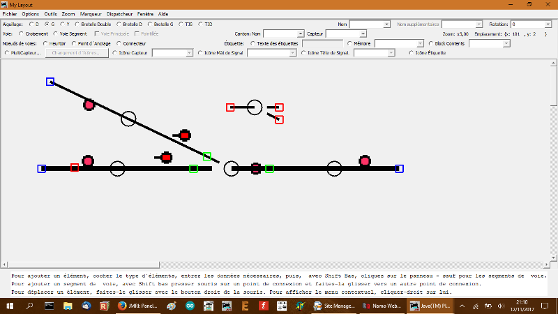 JMRI vous permet de créer et deplacer à l'écran des voies, aiguillages, détection, signaux... - Mettre le plan sur la totalité de l'écran pour voir le bandeau d'instruction en bas. - Pour créer un élément : Choisisser l'élément sur le bandeau et ensuite appuyer sur Majuscule (Shift) et cliquer sourie gauche à l'éndroit de dépot sur le plan. (sauf voies) - Pour déssiner une voie : Choisir "points d'encrage", placer les points d'encrage sur le plans et raccorder les points d'encrage entre eux avec Shift et clic droit de la souris et déplacer jusqu'au prochain point d'encrage. - Déplasser un élément : Maintener Clic droit sur un point d'encrage et déplacer l'objet.